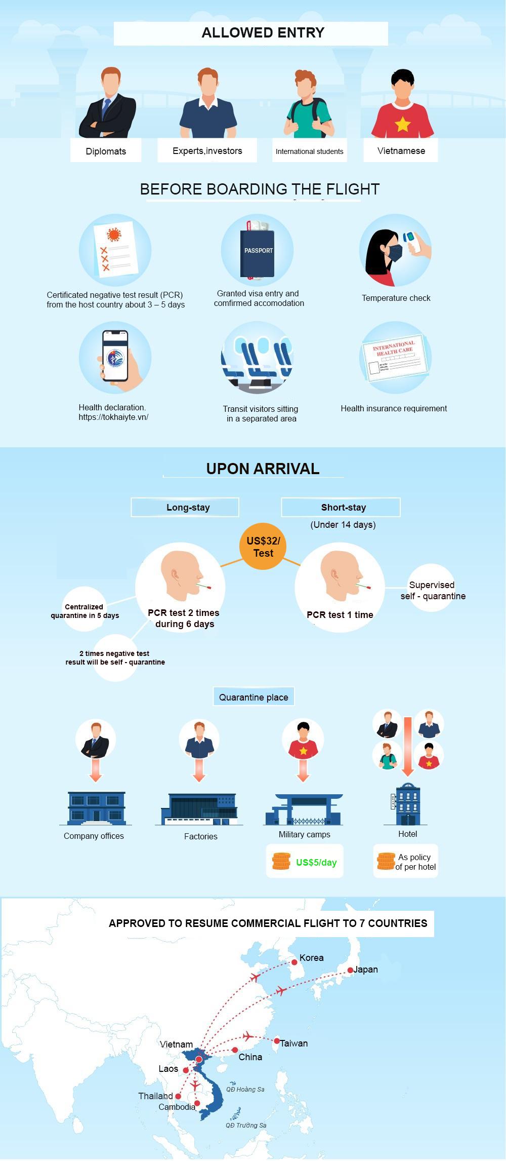 It requires all people must have a negative test result (PCR) from the host country about 3 days before boarding flight to Vietnam. Upon arrival in Vietnam, travellers are quarantined 5days and during this time will have two PCR tests; If the result is negative, passengers guests will be transferred to home and starting working but under monitoring.